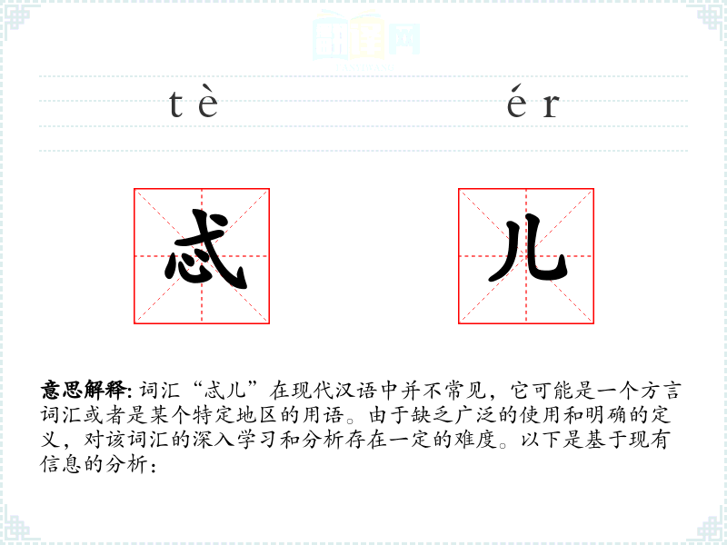 词汇“忒儿”在现代汉语中并不常见,它可能是一个方言词汇或者是某个特定地区的用语。由于缺乏广泛的使用和明确的定义,对该词汇的深入学习和分析存在一定的难度。以下是基于现有信息的分析: