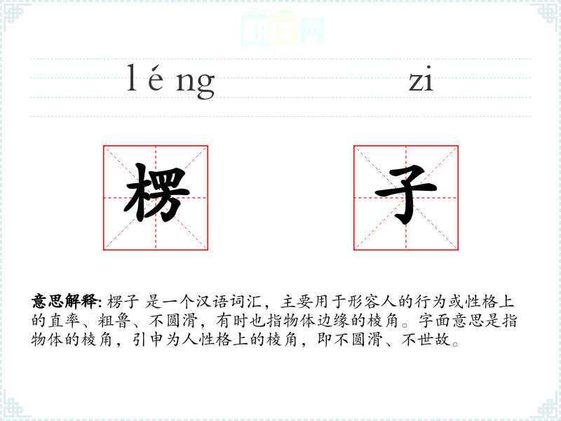 楞子 是一个汉语词汇,主要用于形容人的行为或性格上的直率、粗鲁、不圆滑,有时也指物体边缘的棱角。字面意思是指物体的棱角,引申为人性格上的棱角,即不圆滑、不世故。