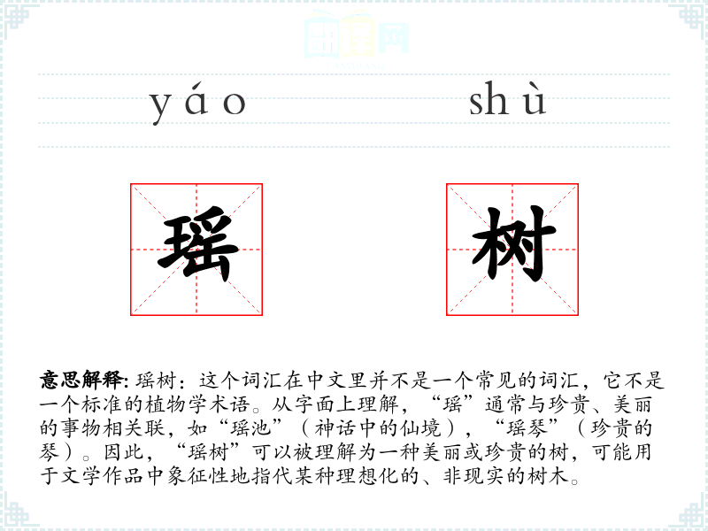 瑶树:这个词汇在中文里并不是一个常见的词汇,它不是一个标准的植物学术语。从字面上理解,“瑶”通常与珍贵、美丽的事物相关联,如“瑶池”(神话中的仙境),“瑶琴”(珍贵的琴)。因此,“瑶树”可以被理解为一种美丽或珍贵的树,可能用于文学作品中象征性地指代某种理想化的、非现实的树木。