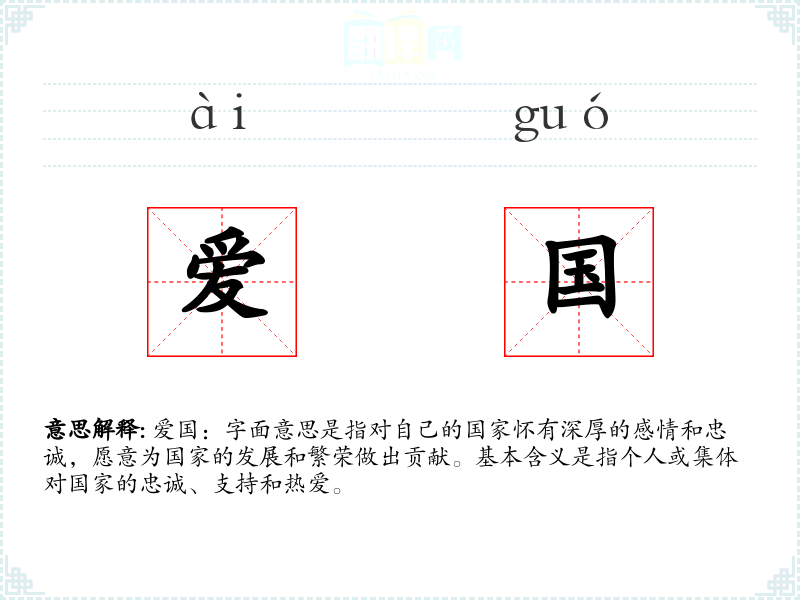 爱国:字面意思是指对自己的国家怀有深厚的感情和忠诚,愿意为国家的发展和繁荣做出贡献。基本含义是指个人或集体对国家的忠诚、支持和热爱。