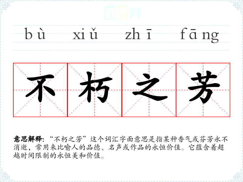 “不朽之芳”这个词汇源自**古代文学,特别是在诗词和文言文中常见。它结合了“不朽”(永不消逝)和“芳”(香气或芬芳)两个概念,形成了独特的比喻意义。随着时间的推移,这个词汇被广泛应用于各种文学和非文学语境中,用以表达永恒的价值和影响。