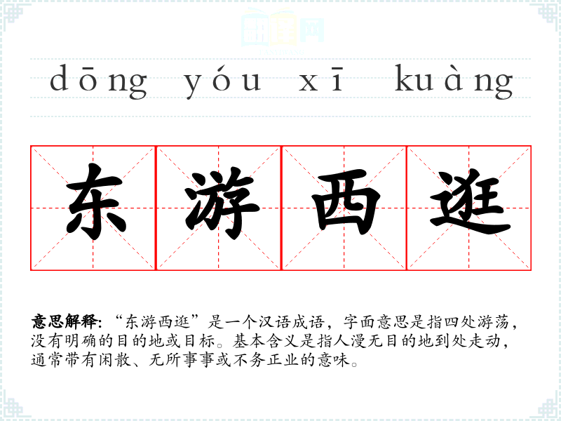 “东游西逛”是一个汉语成语,字面意思是指四处游荡,没有明确的目的地或目标。基本含义是指人漫无目的地到处走动,通常带有闲散、无所事事或不务正业的意味。