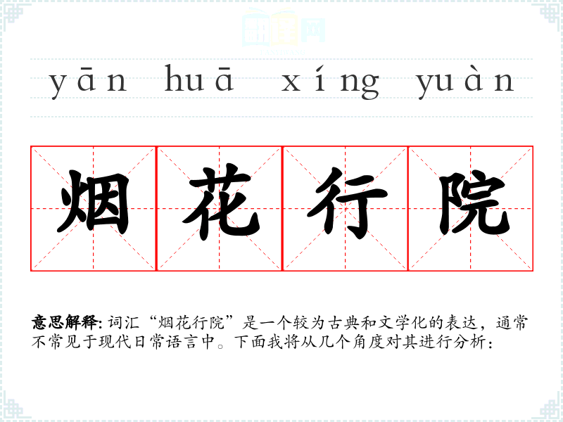 词汇“烟花行院”是一个较为古典和文学化的表达,通常不常见于现代日常语言中。下面我将从几个角度对其进行分析: