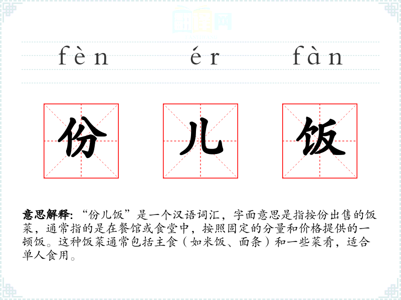 “份儿饭”是一个汉语词汇,字面意思是指按份出售的饭菜,通常指的是在餐馆或食堂中,按照固定的分量和价格提供的一顿饭。这种饭菜通常包括主食(如米饭、面条)和一些菜肴,适合单人食用。