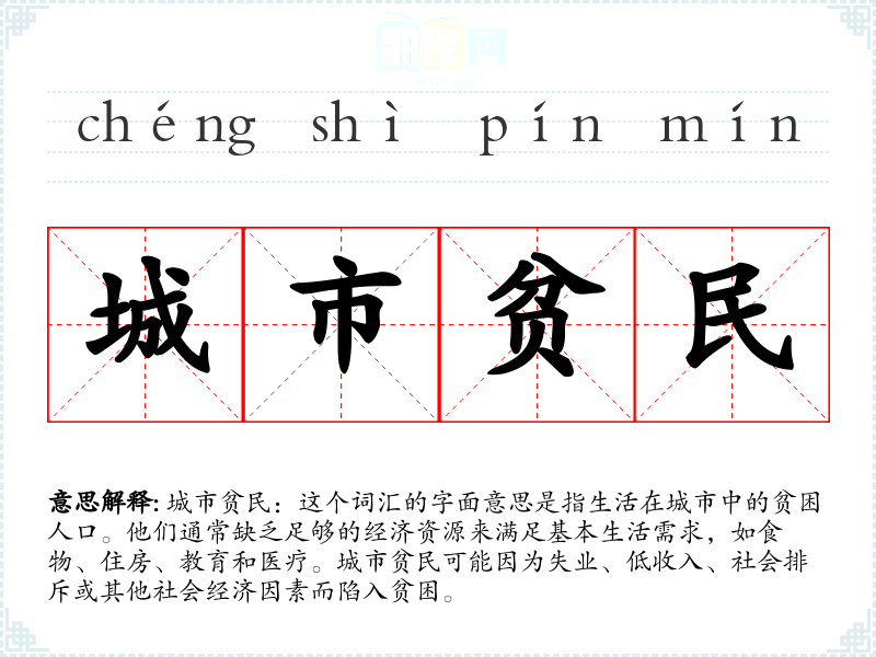 城市贫民:这个词汇的字面意思是指生活在城市中的贫困人口。他们通常缺乏足够的经济资源来满足基本生活需求,如食物、住房、教育和医疗。城市贫民可能因为失业、低收入、社会排斥或其他社会经济因素而陷入贫困。