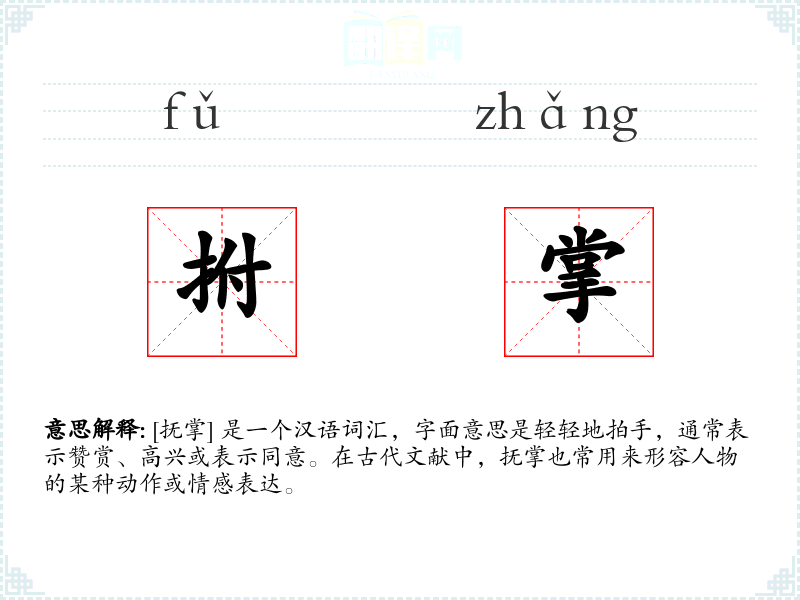 抚掌作为一个词汇,不仅描述了一个具体的动作,还承载了赞赏和鼓励的情感。在语言学*和表达中,理解和正确使用这样的词汇能够丰富我们的表达方式,增强沟通的效果。
