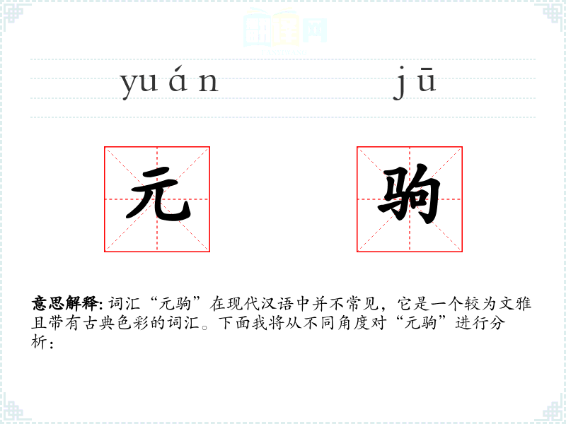 词汇“元驹”在现代汉语中并不常见,它是一个较为文雅且带有古典色彩的词汇。下面我将从不同角度对“元驹”进行分析: