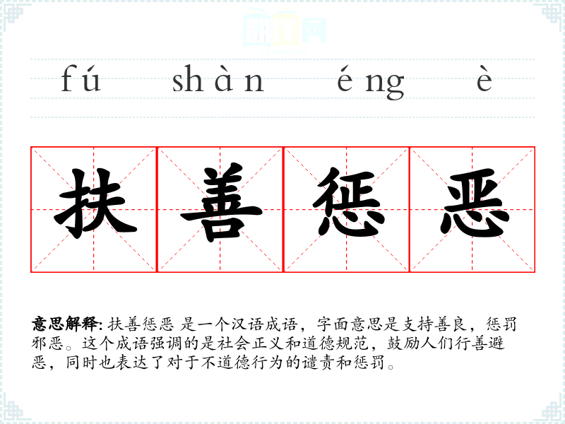 在文化中,扶善惩恶** 是一个重要的道德准则,反映了儒家思想中的“仁义”和“礼法”。在社会背景中,这个成语常常被用来强调法律的公正性和社会道德的重要性。