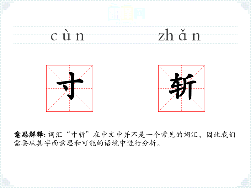“寸斩”字面意思可能是指“以寸为单位进行斩击”,暗示一种精确或微小的斩击动作。然而,这个词汇在现代汉语中并不常见,可能是一个生僻词或者特定领域的术语。