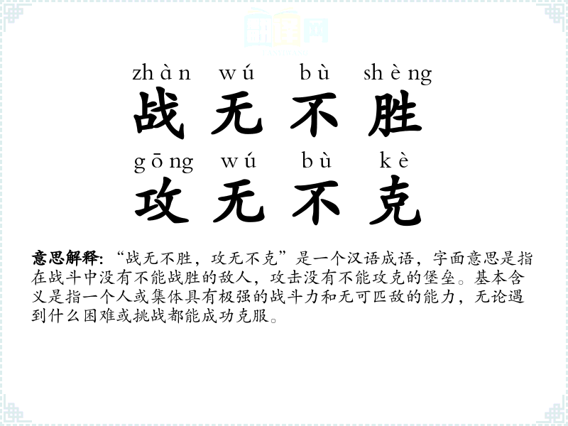 “战无不胜,攻无不克”是一个汉语成语,字面意思是指在战斗中没有不能战胜的敌人,攻击没有不能攻克的堡垒。基本含义是指一个人或集体具有极强的战斗力和无可匹敌的能力,无论遇到什么困难或挑战都能成功克服。