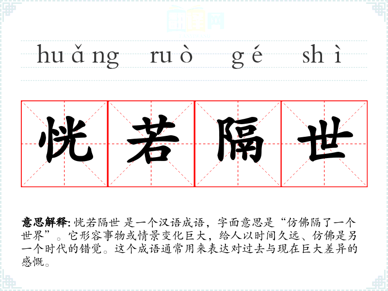 恍若隔世 这个成语深刻地表达了时间流逝和变化的主题,它在文学和日常语言中都有着广泛的应用。通过对这个词汇的学和分析,我更加理解了汉语中对时间感和历史变迁的表达方式,这对于我的语言学和文化理解都有着重要的意义。