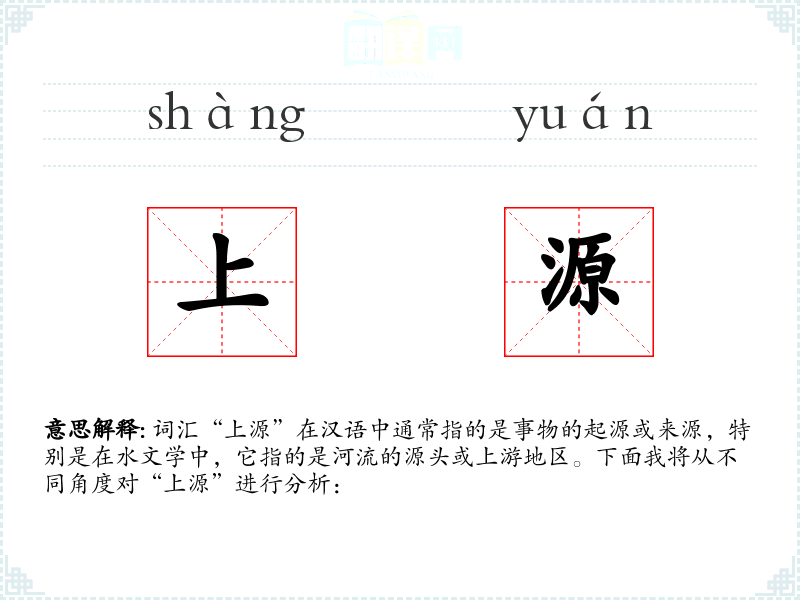 “上源”一词由“上”和“源”两个字组成。“上”表示高处或上方,“源”表示水源或起源。在古代汉语中,“源”已经用来表示水的发源地,而“上”则加强了这种起始的意味。