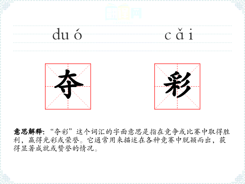 “夺彩”这个词汇的字面意思是指在竞争或比赛中取得胜利,赢得光彩或荣誉。它通常用来描述在各种竞赛中脱颖而出,获得显著成就或赞誉的情况。