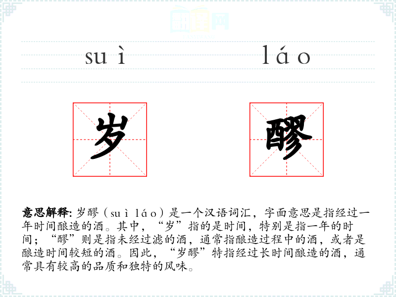岁醪(suì láo)是一个汉语词汇,字面意思是指经过一年时间酿造的酒。其中,“岁”指的是时间,特别是指一年的时间;“醪”则是指未经过滤的酒,通常指酿造过程中的酒,或者是酿造时间较短的酒。因此,“岁醪”特指经过长时间酿造的酒,通常具有较高的品质和独特的风味。