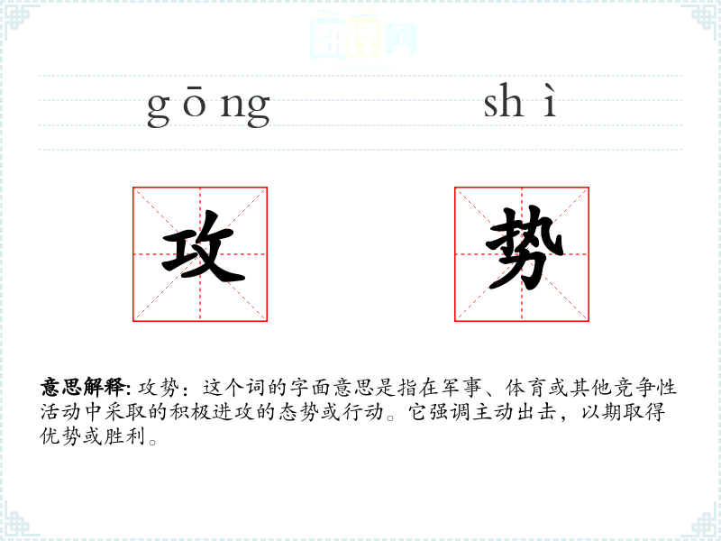 攻势:这个词的字面意思是指在军事、体育或其他竞争性活动中采取的积极进攻的态势或行动。它强调主动出击,以期取得优势或胜利。