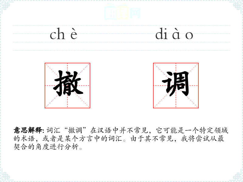 词汇“撤调”在汉语中并不常见,它可能是一个特定领域的术语,或者是某个方言中的词汇。由于其不常见,我将尝试从最契合的角度进行分析。