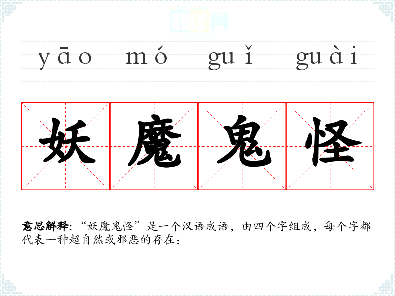 “妖魔鬼怪”是一个汉语成语,由四个字组成,每个字都代表一种超自然或邪恶的存在: