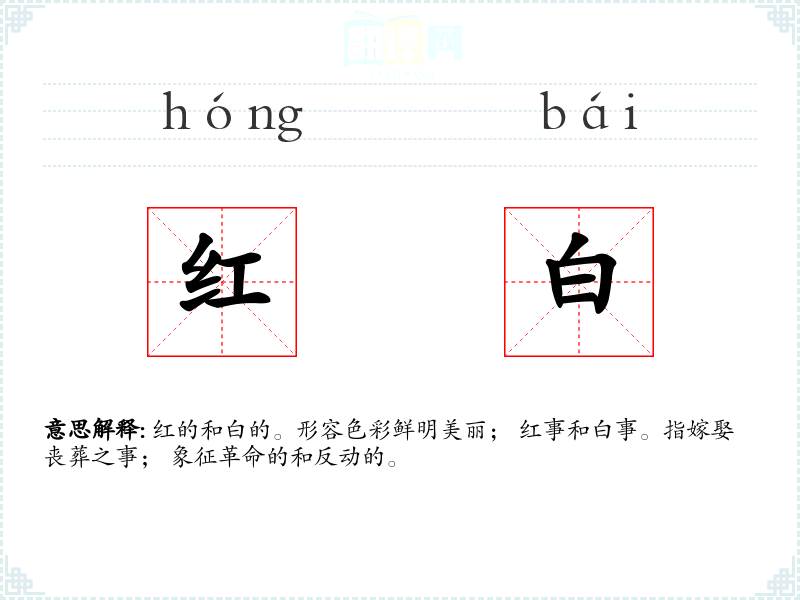 红的和白的。形容色彩鲜明美丽; 红事和白事。指嫁娶丧葬之事; 象征革命的和反动的。