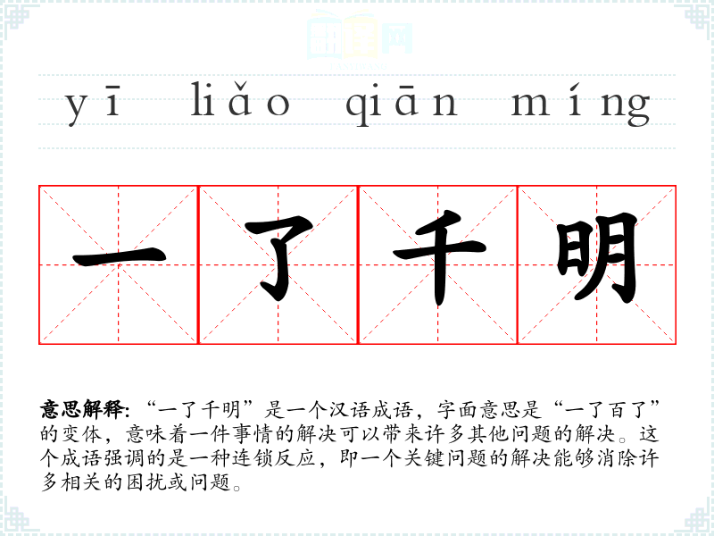 “一了千明”是一个汉语成语,字面意思是“一了百了”的变体,意味着一件事情的解决可以带来许多其他问题的解决。这个成语强调的是一种连锁反应,即一个关键问题的解决能够消除许多相关的困扰或问题。