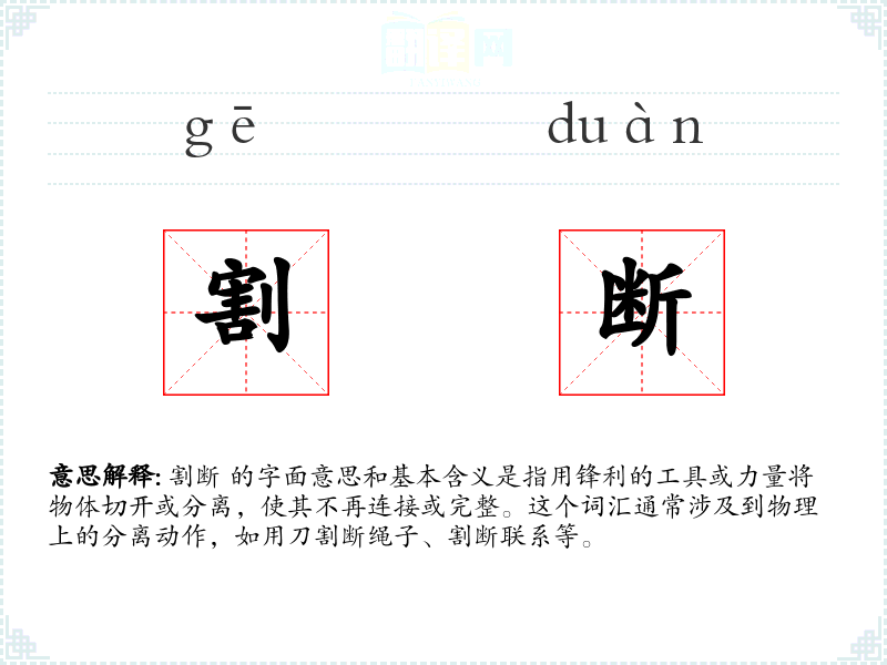 割断 的字面意思和基本含义是指用锋利的工具或力量将物体切开或分离,使其不再连接或完整。这个词汇通常涉及到物理上的分离动作,如用刀割断绳子、割断联系等。