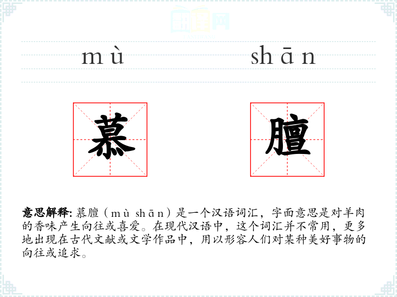 慕膻(mù shān)是一个汉语词汇,字面意思是对羊肉的香味产生向往或喜爱。在现代汉语中,这个词汇并不常用,更多地出现在古代文献或文学作品中,用以形容人们对某种美好事物的向往或追求。