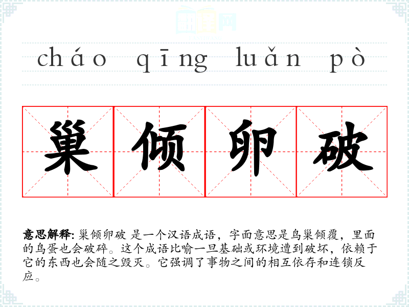 巢倾卵破 这个成语出自《左传·僖公二十三年》:“巢倾卵破,其谁之咎?”原指鸟巢倾覆,鸟蛋破碎,后引申为比喻基础破坏,依赖于它的东西也会遭殃。