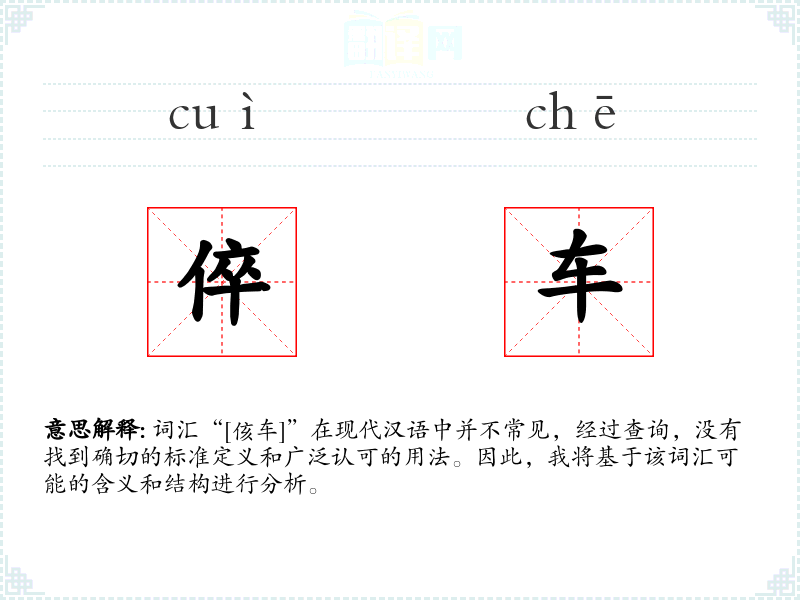 词汇“[侅车]”在现代汉语中并不常见,经过查询,没有找到确切的标准定义和广泛认可的用法。因此,我将基于该词汇可能的含义和结构进行分析。