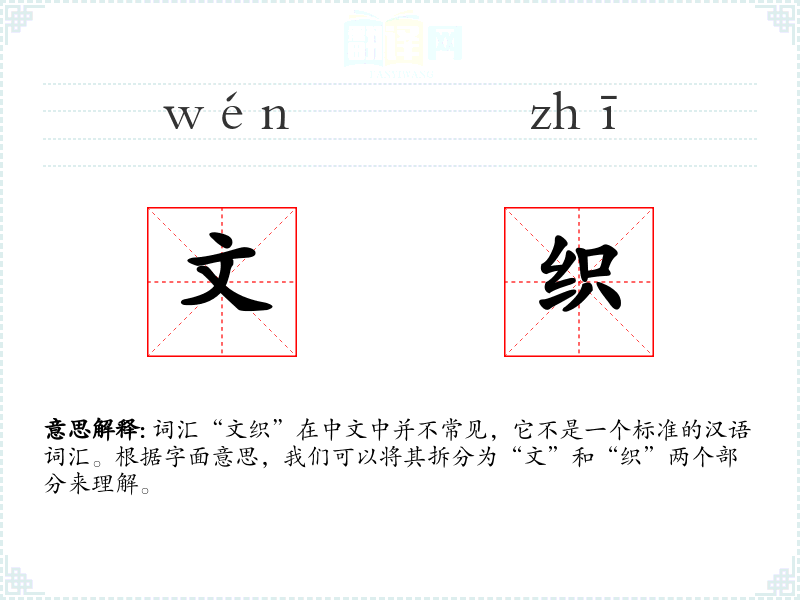 词汇“文织”在中文中并不常见,它不是一个标准的汉语词汇。根据字面意思,我们可以将其拆分为“文”和“织”两个部分来理解。