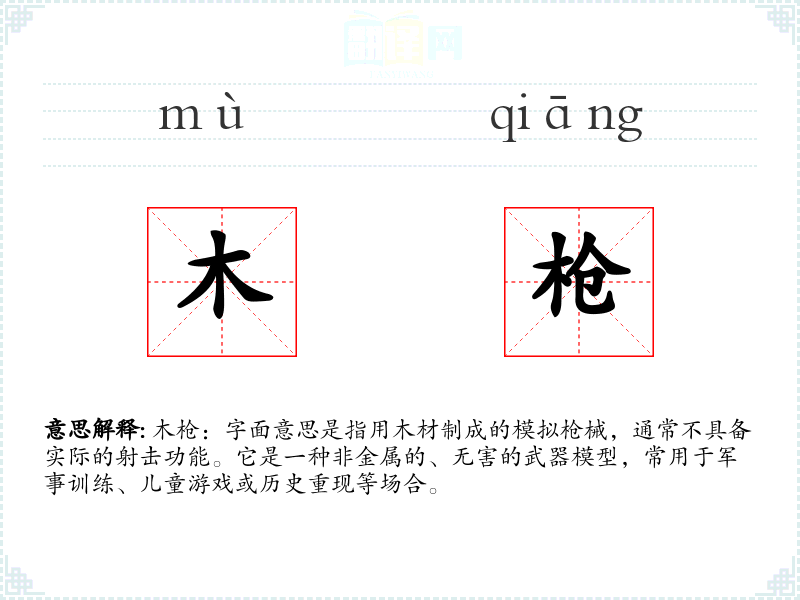 木枪:字面意思是指用木材制成的模拟枪械,通常不具备实际的射击功能。它是一种非金属的、无害的武器模型,常用于军事训练、儿童游戏或历史重现等场合。