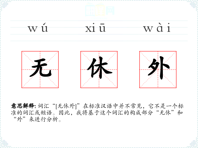 词汇“[无休外]”在标准汉语中并不常见,它不是一个标准的词汇或短语。因此,我将基于这个词汇的构成部分“无休”和“外”来进行分析。