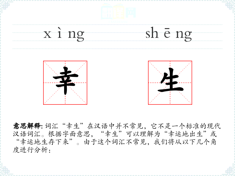 词汇“幸生”在汉语中并不常见,它不是一个标准的现代汉语词汇。根据字面意思,“幸生”可以理解为“幸运地出生”或“幸运地生存下来”。由于这个词汇不常见,我们将从以下几个角度进行分析: