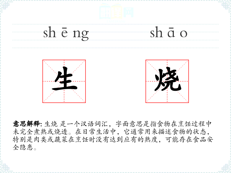 "生烧"一词源于汉语,"生"指未成熟或未完成,"烧"指烹饪过程中的加热。随着食品安全意识的提高,这个词在现代汉语中的使用频率有所增加。