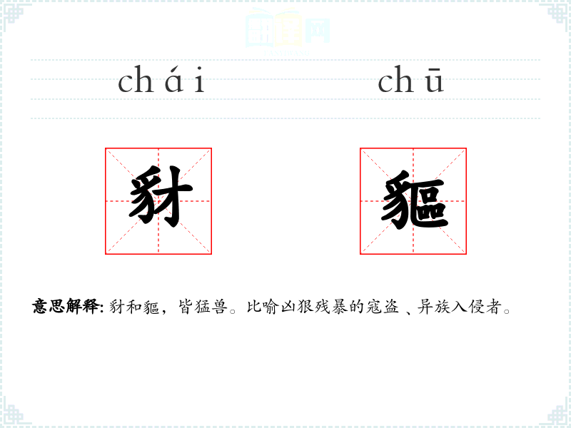 豺和貙,皆猛兽。比喻凶狠残暴的寇盗﹑异族入侵者。
