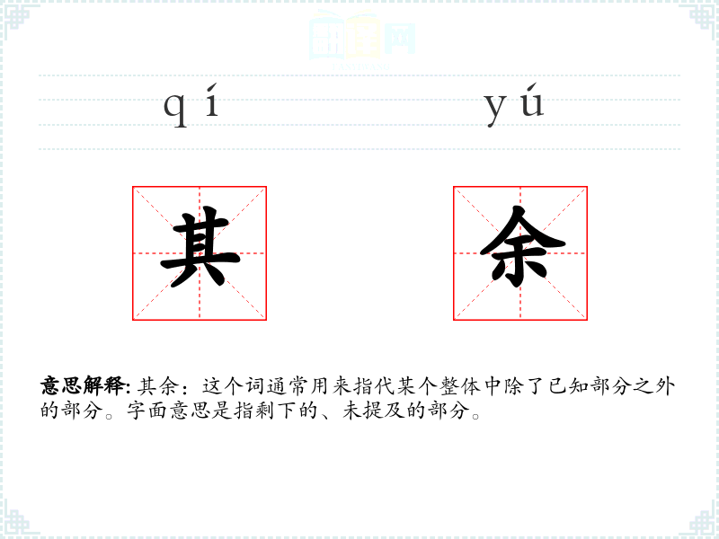 其余:这个词通常用来指代某个整体中除了已知部分之外的部分。字面意思是指剩下的、未提及的部分。