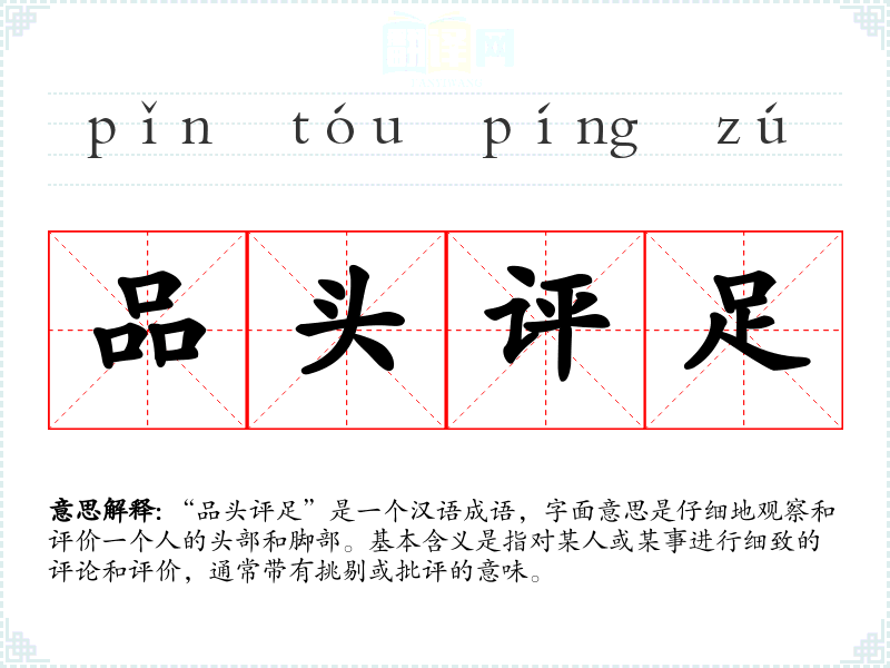 “品头评足”是一个汉语成语,字面意思是仔细地观察和评价一个人的头部和脚部。基本含义是指对某人或某事进行细致的评论和评价,通常带有挑剔或批评的意味。