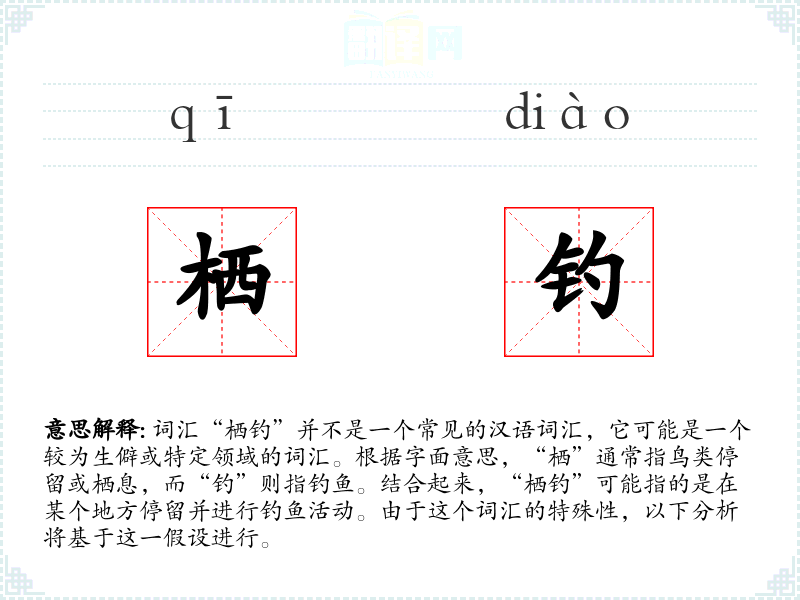 词汇“栖钓”并不是一个常见的汉语词汇,它可能是一个较为生僻或特定领域的词汇。根据字面意思,“栖”通常指鸟类停留或栖息,而“钓”则指钓鱼。结合起来,“栖钓”可能指的是在某个地方停留并进行钓鱼活动。由于这个词汇的特殊性,以下分析将基于这一假设进行。