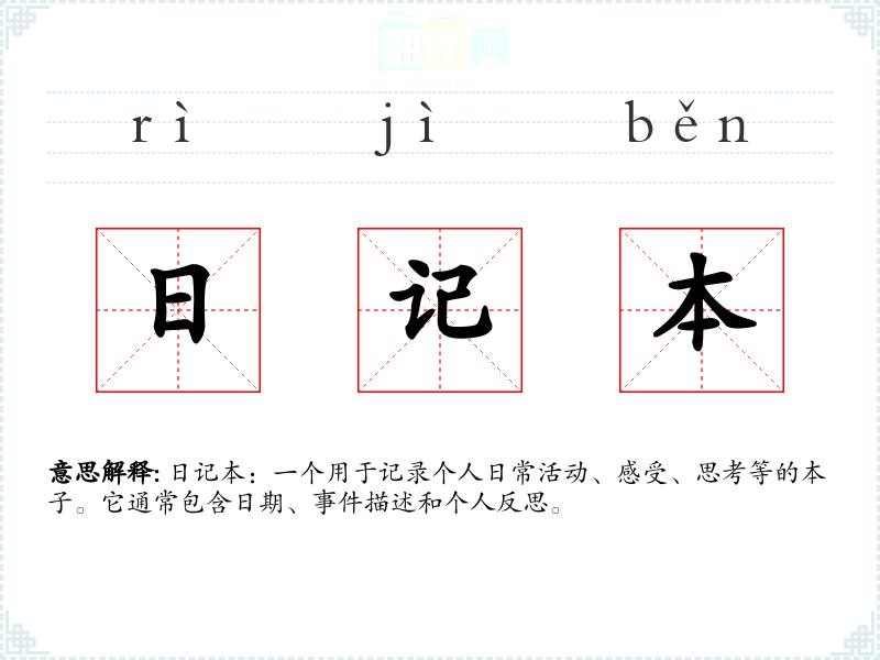 日记本:一个用于记录个人日常活动、感受、思考等的本子。它通常包含日期、**描述和个人反思。