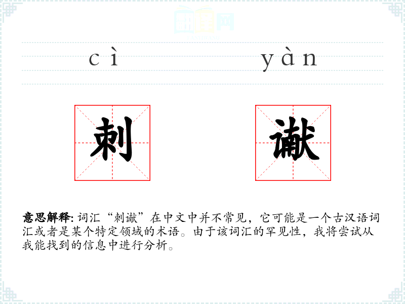 词汇“刺谳”在中文中并不常见,它可能是一个古汉语词汇或者是某个特定领域的术语。由于该词汇的罕见性,我将尝试从我能找到的信息中进行分析。