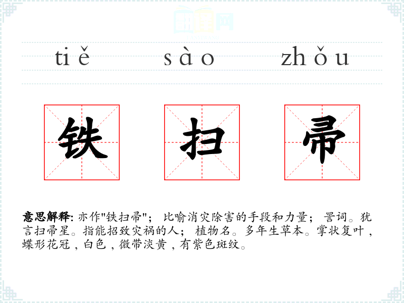 亦作"铁扫帚"; 比喻消灾除害的手段和力量; 詈词。犹言