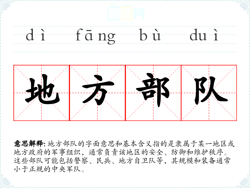 - 反义词:中央军、正规军。这些词汇指代国家中央控制的军事力量,与地方部队形成对比。
