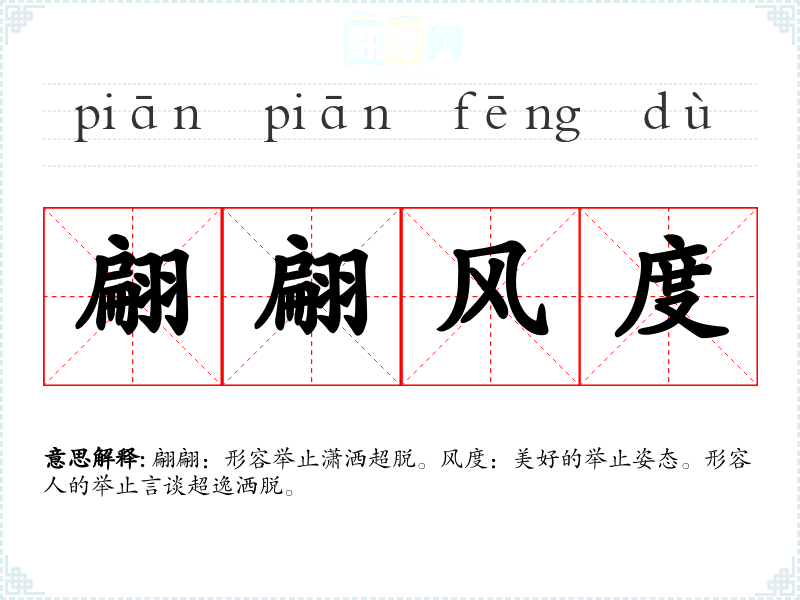 翩翩:形容举止潇洒超脱。风度:美好的举止姿态。形容人的举止言谈超逸洒脱。