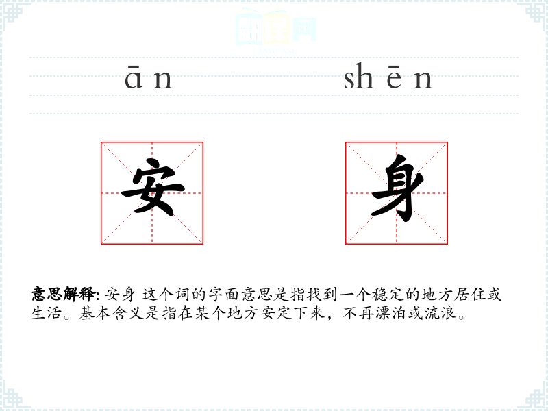 安身 这个词的字面意思是指找到一个稳定的地方居住或生活。基本含义是指在某个地方安定下来,不再漂泊或流浪。