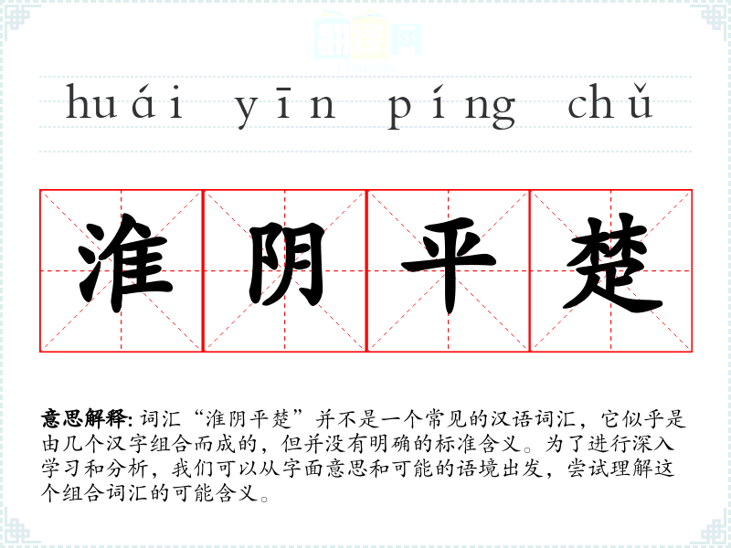 “淮阴平楚”作为一个组合词汇,其含义并不明确,需要结合具体的历史背景和文化语境来理解。在学*汉语时,了解词汇的历史和文化背景是非常重要的,这有助于更深入地理解词汇的含义和用法。
