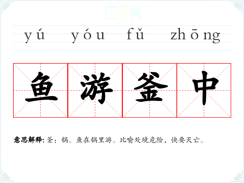 釜:锅。鱼在锅里游。比喻处境危险,快要灭亡。