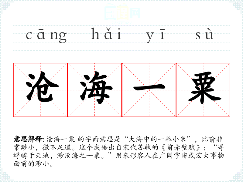 沧海一粟 的字面意思是“大海中的一粒小米”,比喻非常渺小,微不足道。这个成语出自宋代苏轼的《前赤壁赋》:“寄蜉蝣于天地,渺沧海之一粟。”用来形容人在广阔宇宙或宏大事物面前的渺小。