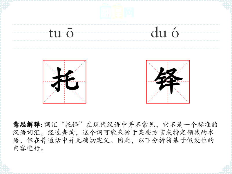 词汇“托铎”在现代汉语中并不常见,它不是一个标准的汉语词汇。经过查询,这个词可能来源于某些方言或特定领域的术语,但在普通话中并无确切定义。因此,以下分析将基于假设性的内容进行。