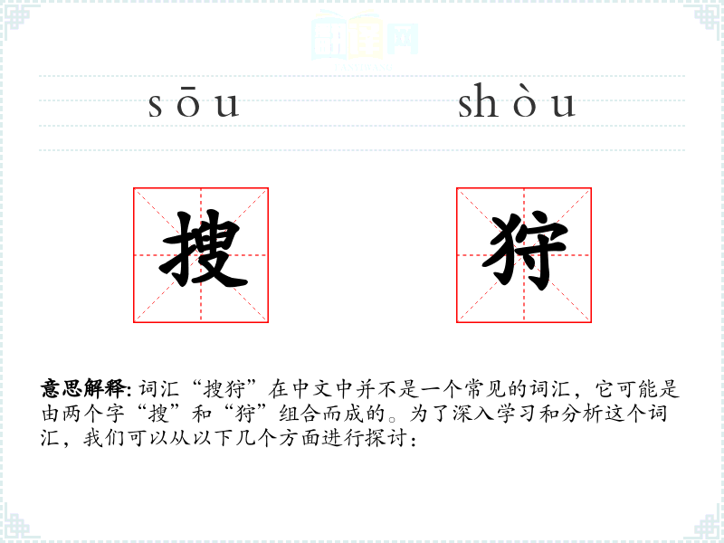 词汇“搜狩”在中文中并不是一个常见的词汇,它可能是由两个字“搜”和“狩”组合而成的。为了深入学*和分析这个词汇,我们可以从以下几个方面进行探讨: