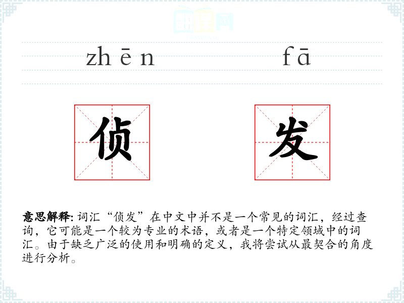 由于“侦发”不是一个标准词汇,对其的理解和应用可能需要更多的背景知识和专业领域内的解释。在语言学习和表达中,了解特定领域内的专业术语是非常重要的,但“侦发”作为一个词汇,其使用和理解可能需要进一步的明确和定义。