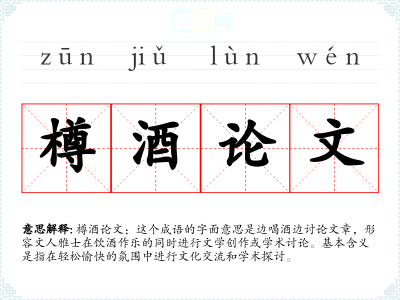 樽酒论文:这个成语的字面意思是边喝酒边讨论文章,形容文人雅士在饮酒作乐的同时进行文学创作或学术讨论。基本含义是指在轻松愉快的氛围中进行文化交流和学术探讨。