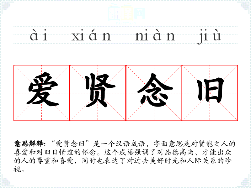 在英语中,类似的表达可能是“cherish old friends and respect the wise”,虽然不如“爱贤念旧”那样简洁和富有诗意,但也传达了相似的情感和价值观。